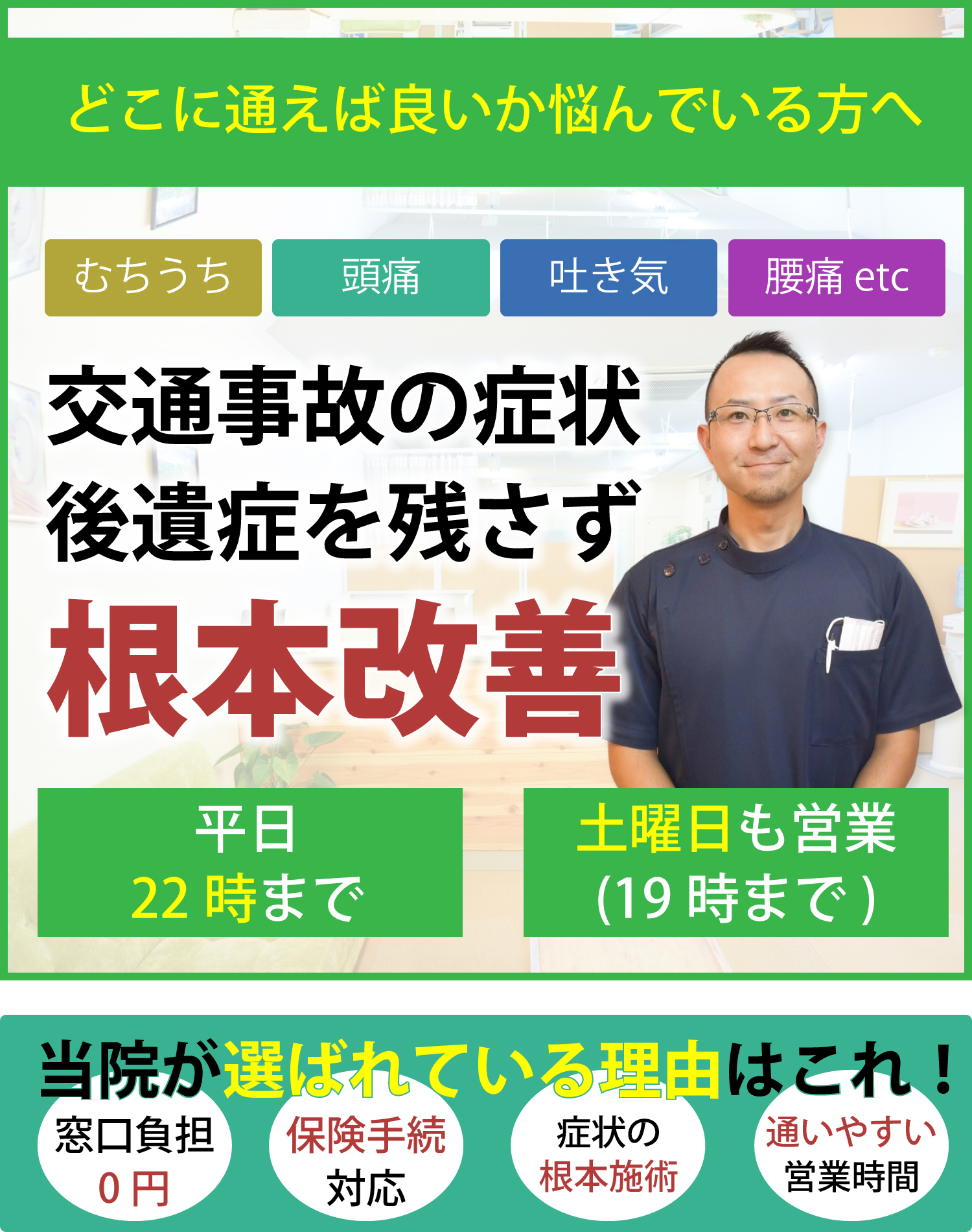 交通事故による後遺症を受け入れるのではなく、一緒に根本改善を目指しましょう。