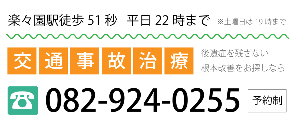 広島市佐伯区楽々園駅の「クルミ整骨院」は交通事故によるむちうち・頭痛・関節の痛み・吐き気などなどの症状を得意としております。