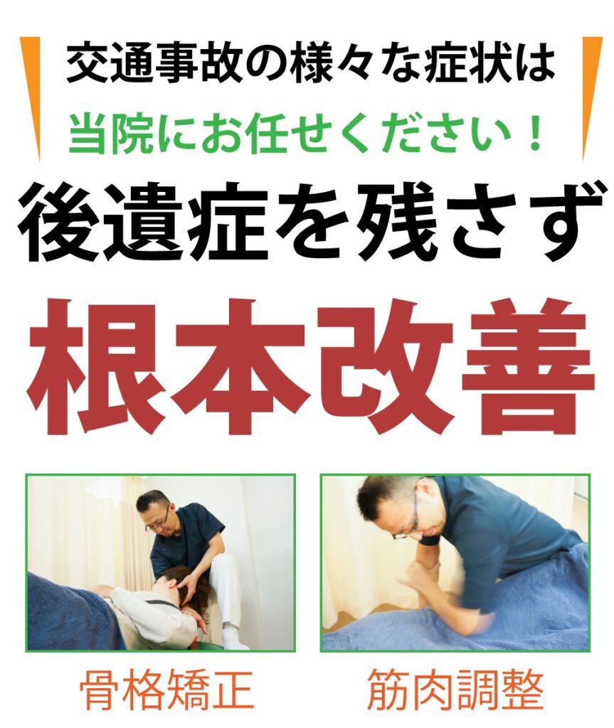 交通事故による諸症状は早期の処置が重要です。また後遺症を残さないために適切な処置も必要です。後遺症に対しても根本原因にアプローチしなければいけません。